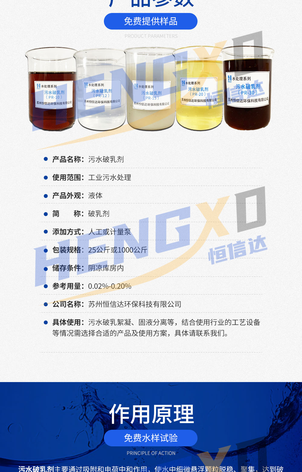 油脂破乳剂产品外观:液体,使用范围:工业水处理,包装规格:25公斤,储存条件:阴凉库房内。油脂破乳剂经稀释后用计量泵或人工投加到污水中,搅拌混合反应后,再经后续工艺处理。