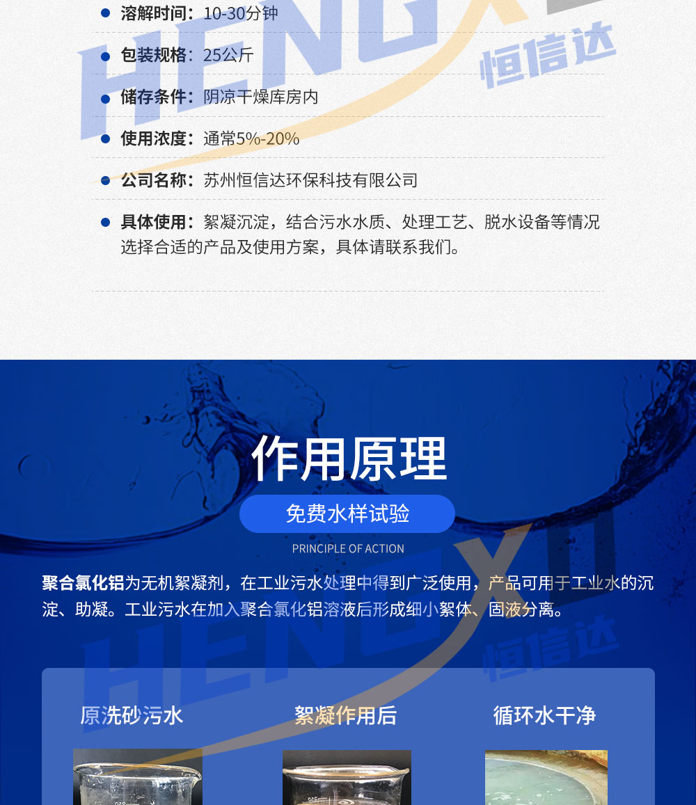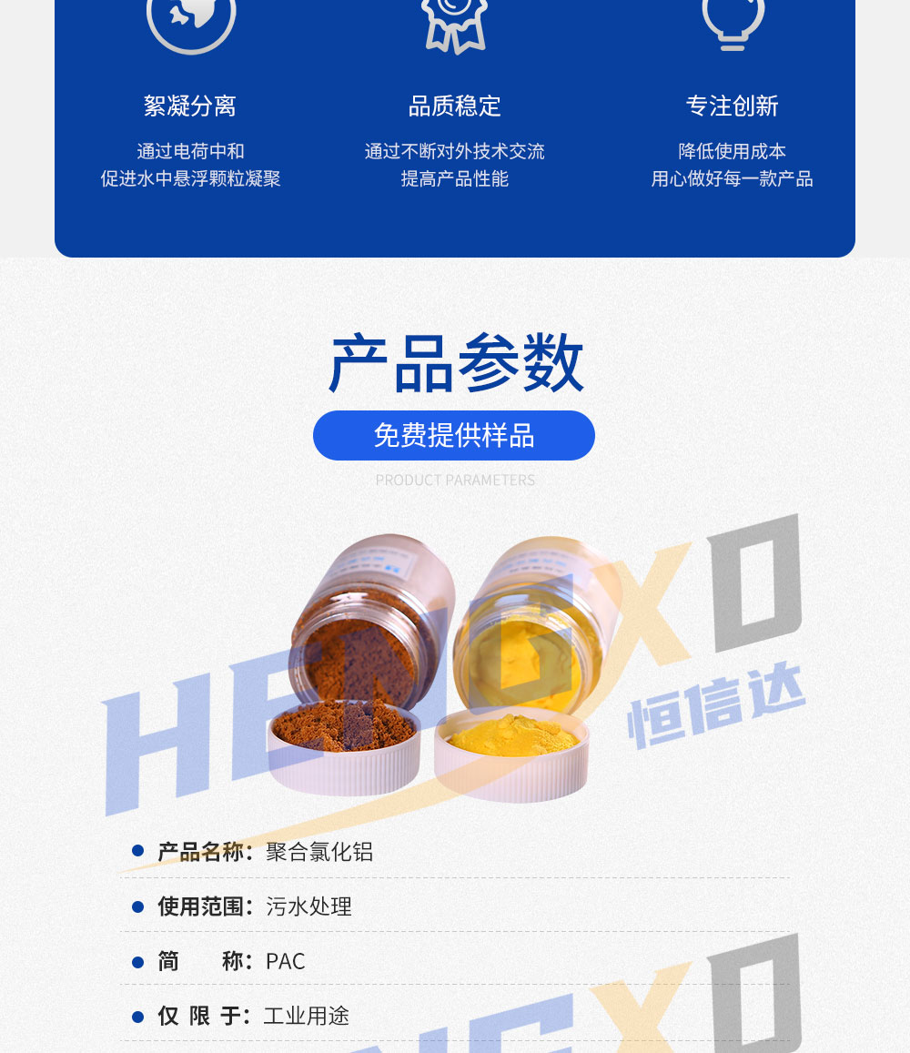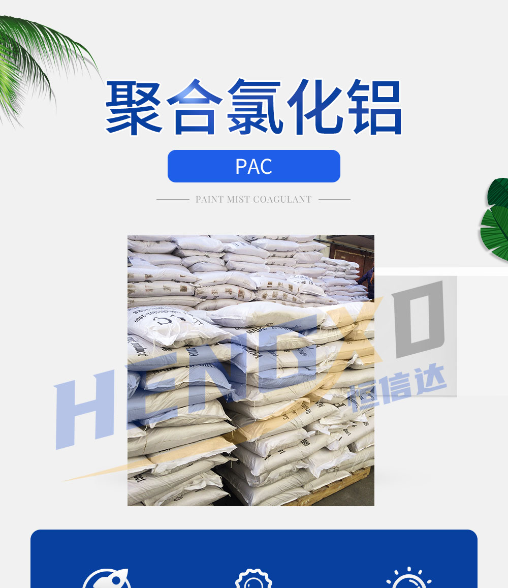 聚合氯化铝,使用范围:污水处理,简称:PAC,包装规格:25公斤,储存条件:阴凉干燥库房内,使用浓度:通常5%-20%,使用方法:1、产品溶解时一般用自来水,2、按照5 %-20%的浓度配制水溶液,3、溶解时间通常为10-30分钟。适用行业:纺织印染污水、造纸污水、电子电镀污水、养殖污水、化工污水、制药污水、食品污水等工业污水处理。