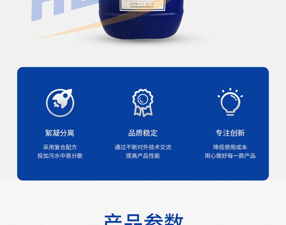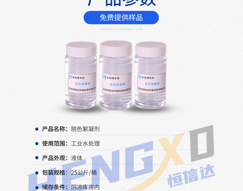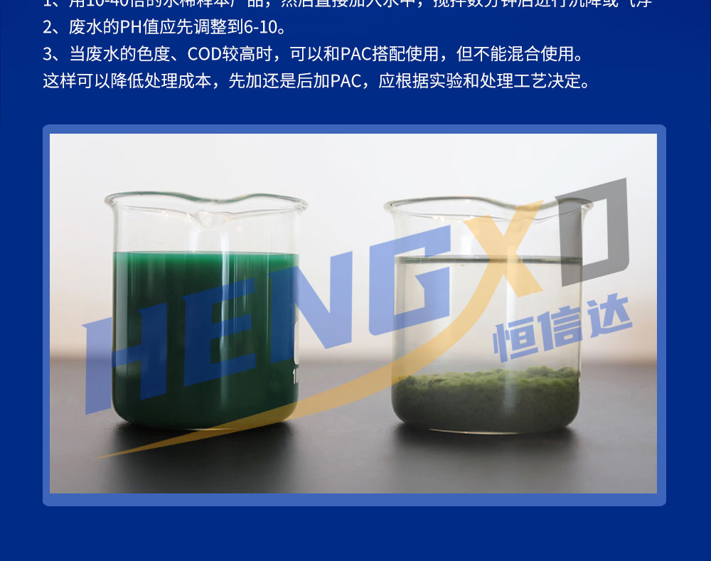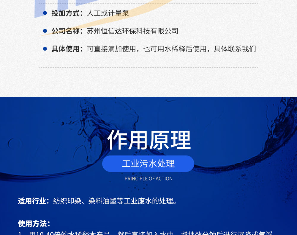 脱色剂使用范围:污水处理,产品外观:无色或浅色,包装规格:25公斤/桶或吨桶装,储存条件:阴凉库房内,适用行业:纺织印染、染料油墨等工业废水的处理。脱色剂使用方法:1、用10-40倍的水稀释本产品,然后直接加入水中,搅拌数分钟后进行沉降或气浮。2、废水的PH值应先调整到6-10。3、当废水的色度、COD较高时,可以和PAC搭配使用,但不能混合使用。